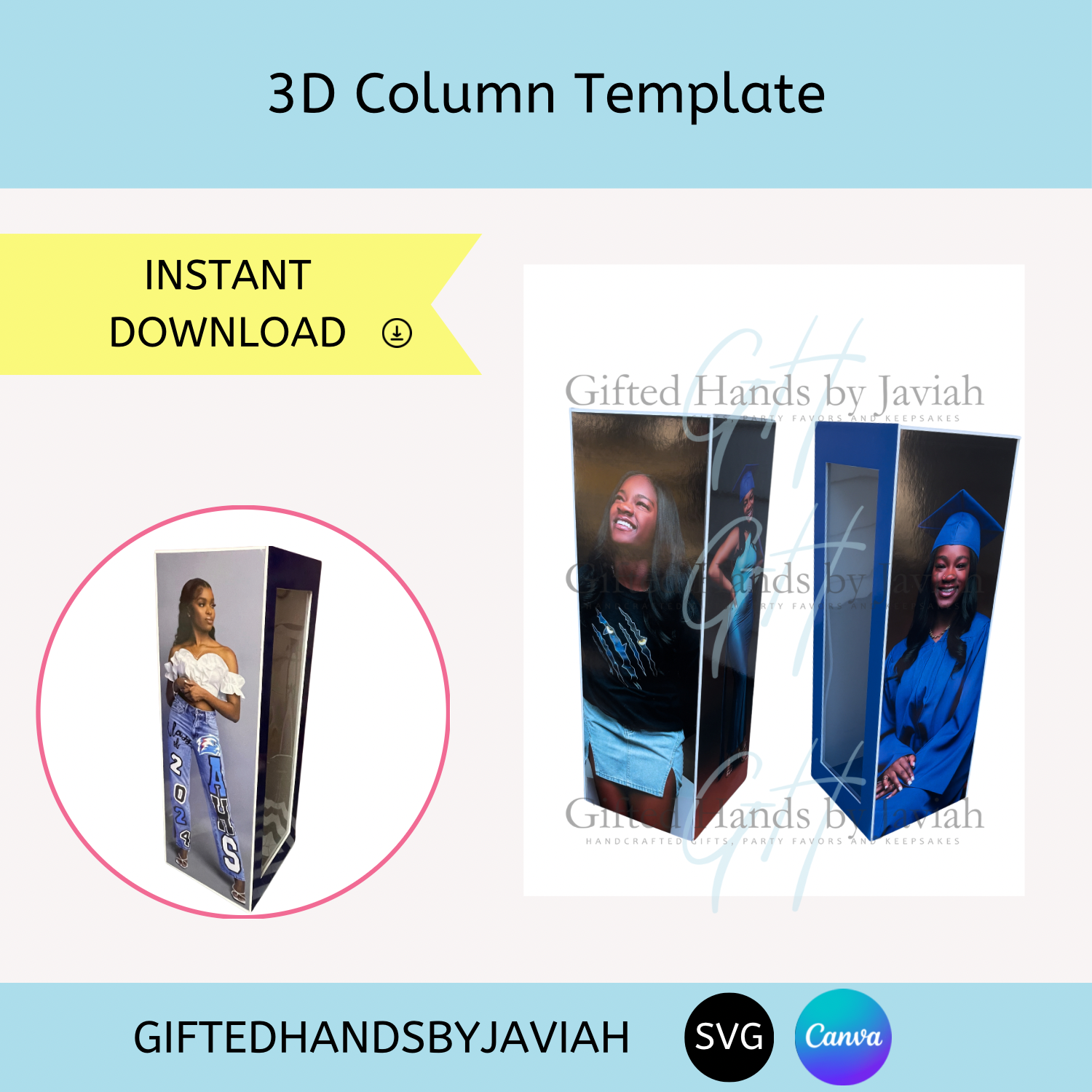 With these files, you can create your own 3D or peeka boo columns. These files are compatible with Canva and Canva Pro. You can also use these files in other programs as well. With these files, you will need to create your own design from scratch. You will receive the the templates for the Front, Back, Sides, Bases and Top Cover of the column. The sizes of each individual template/panel is also included. These files are created for those creatives with knowledge and experience with their designing software of choice.