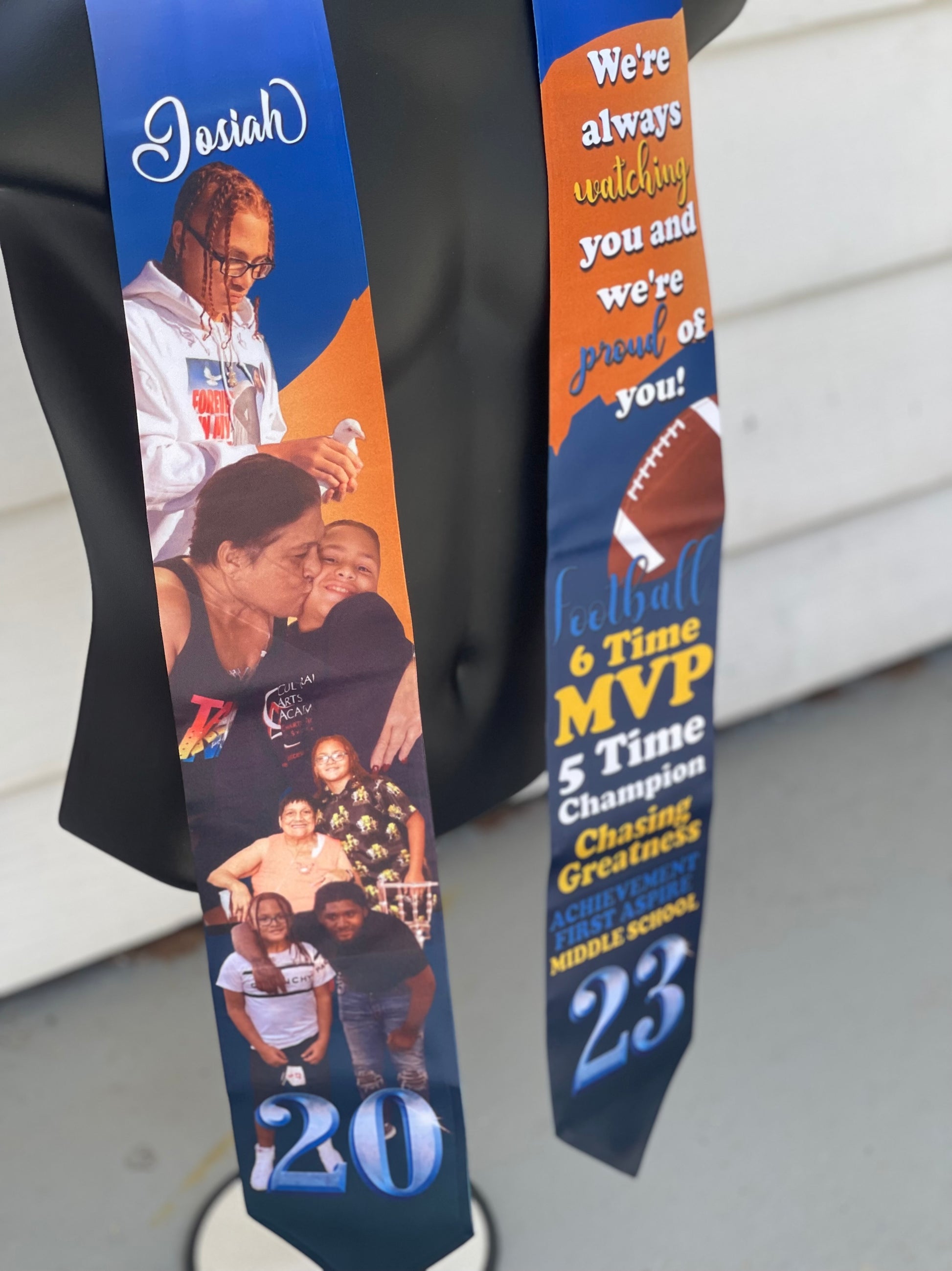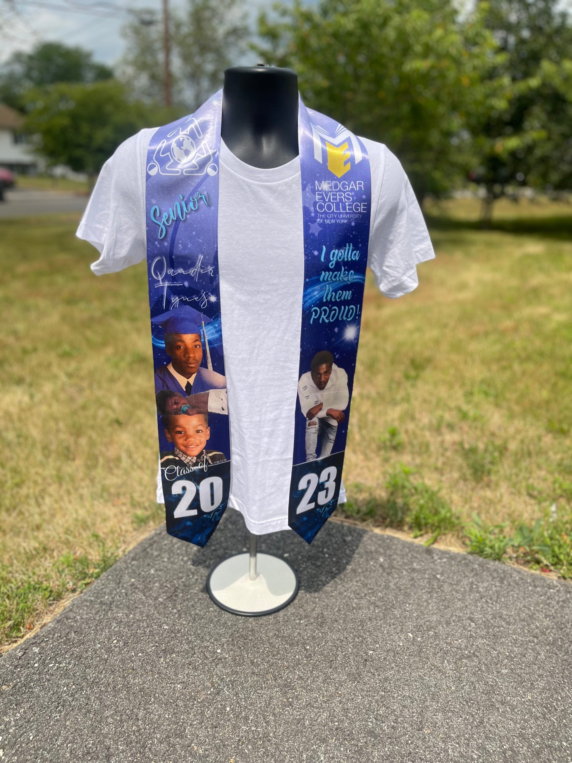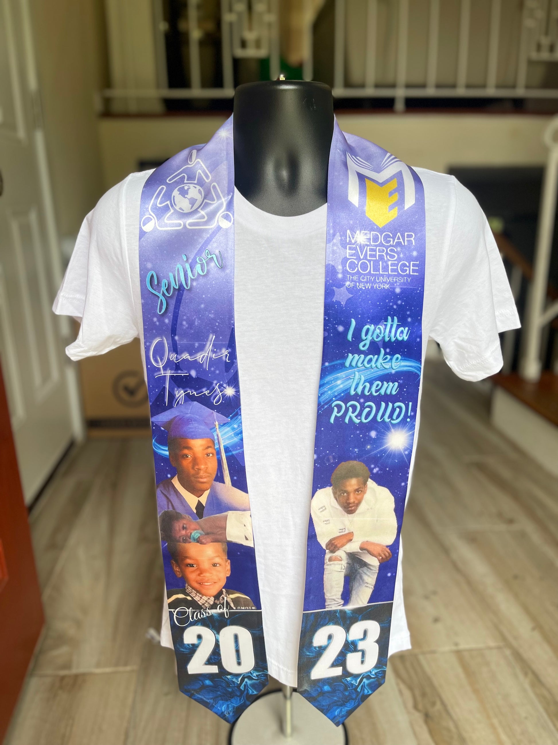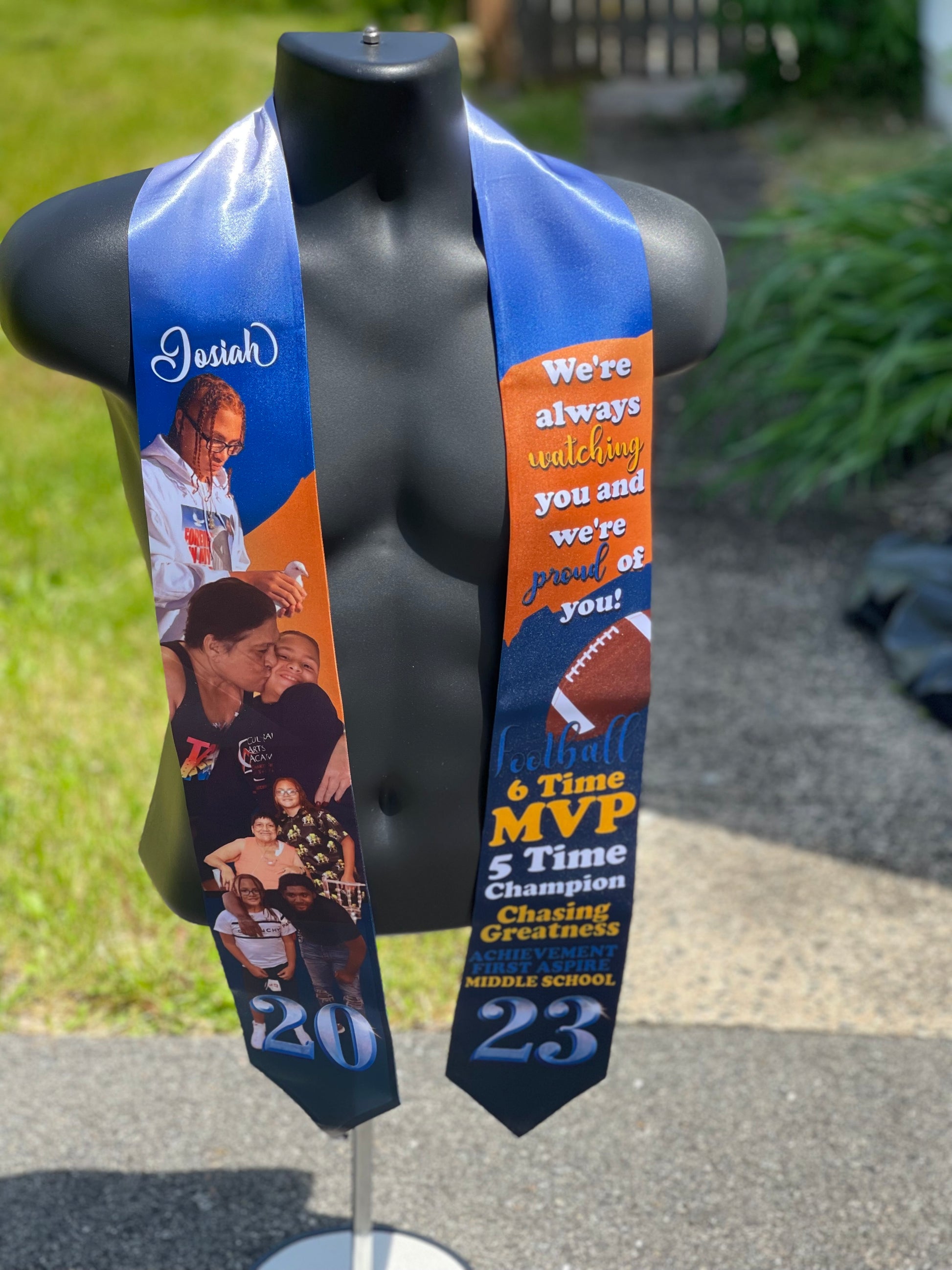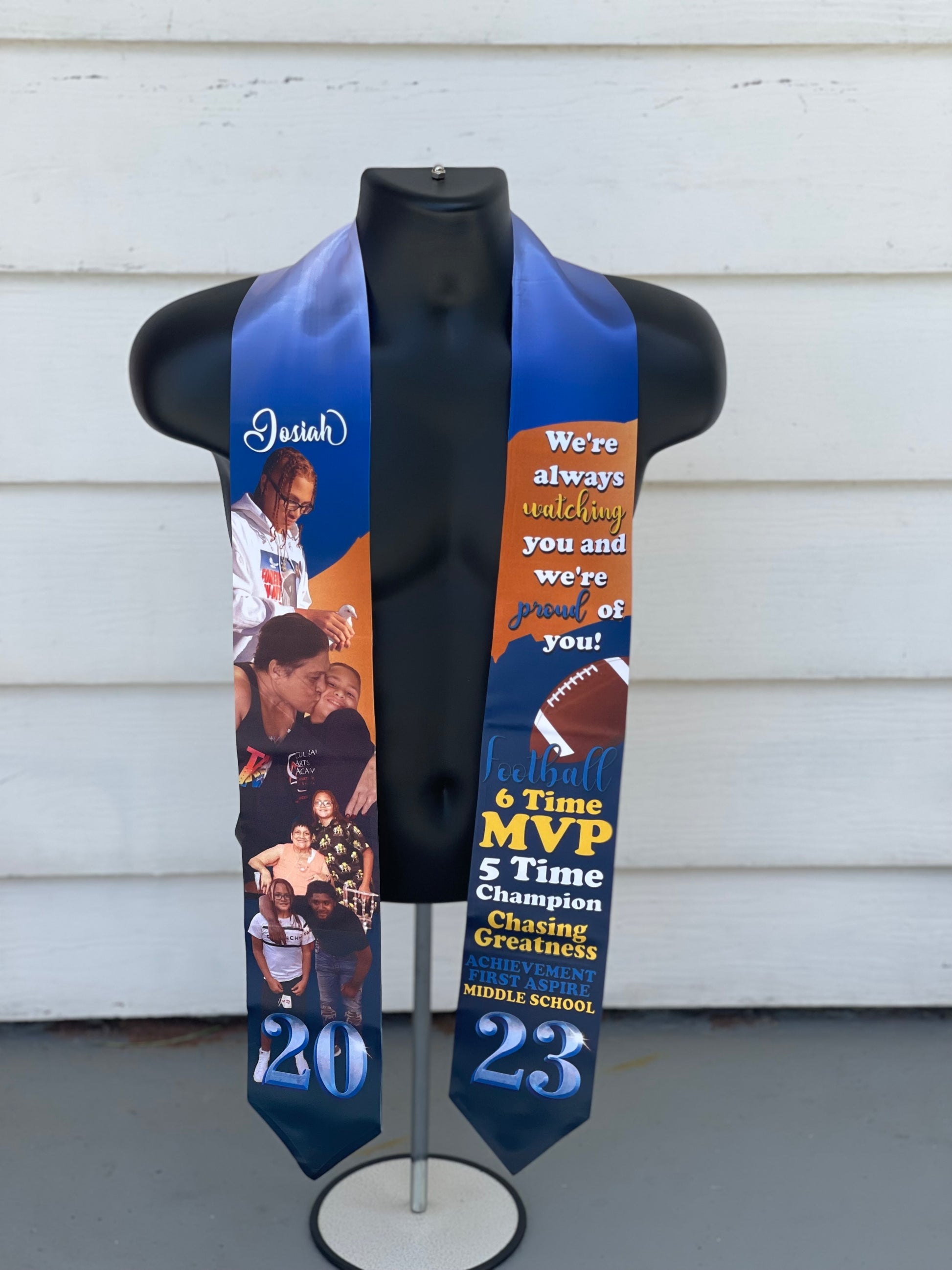 Beautiful customized graduation stole for our wonderful graduates! Stoles can be customized using pictures, scriptures, graduate's name, school name, school emblems/mascots, colors, and more! Please upload at least 4 high resolution images. Our adult stoles approx 70.”