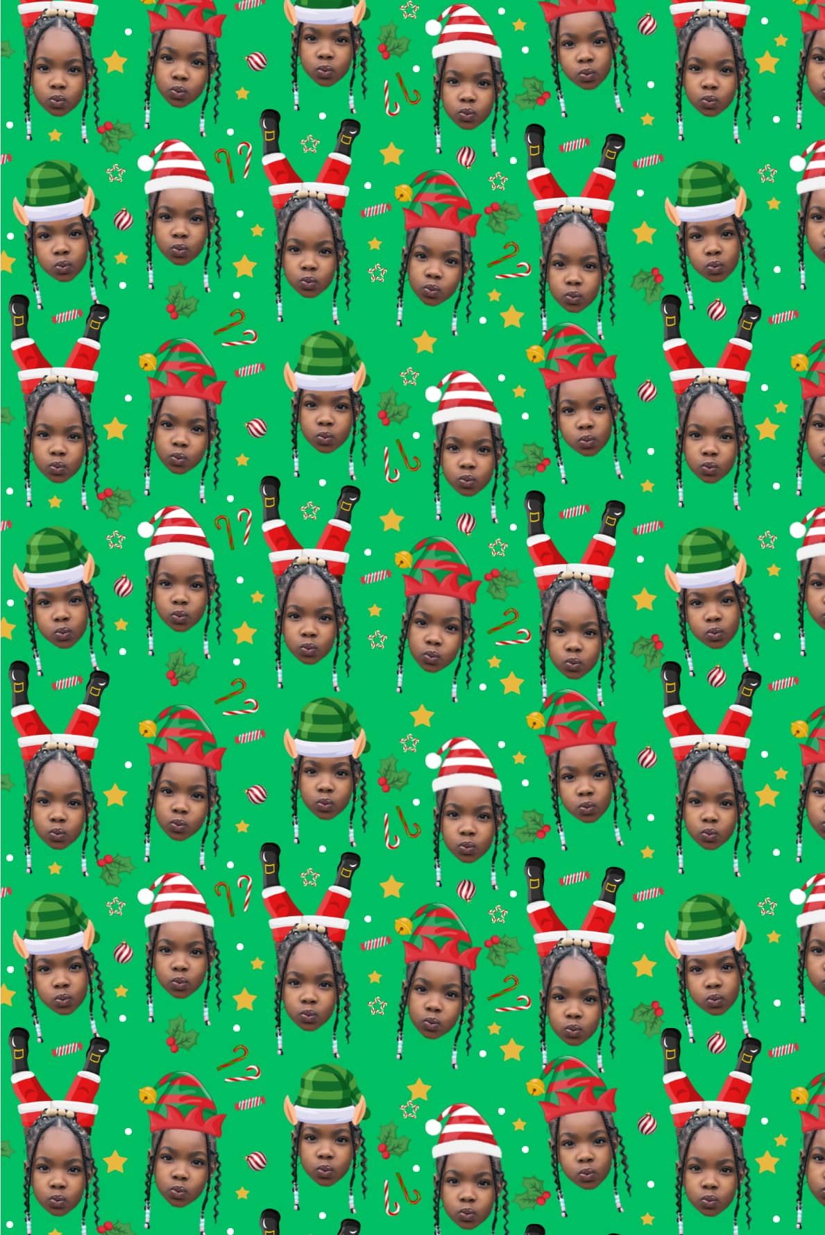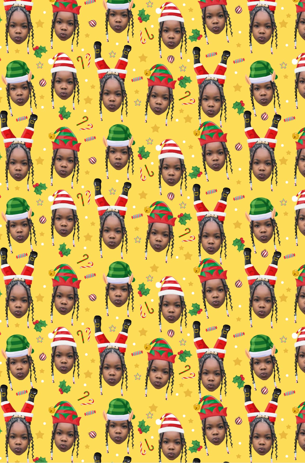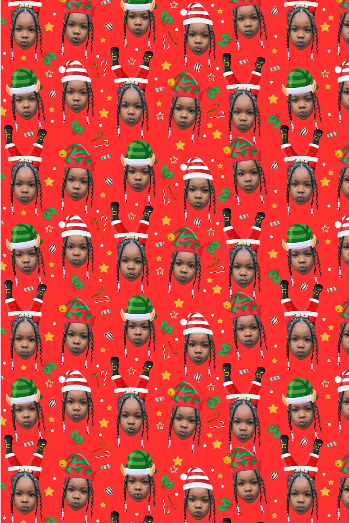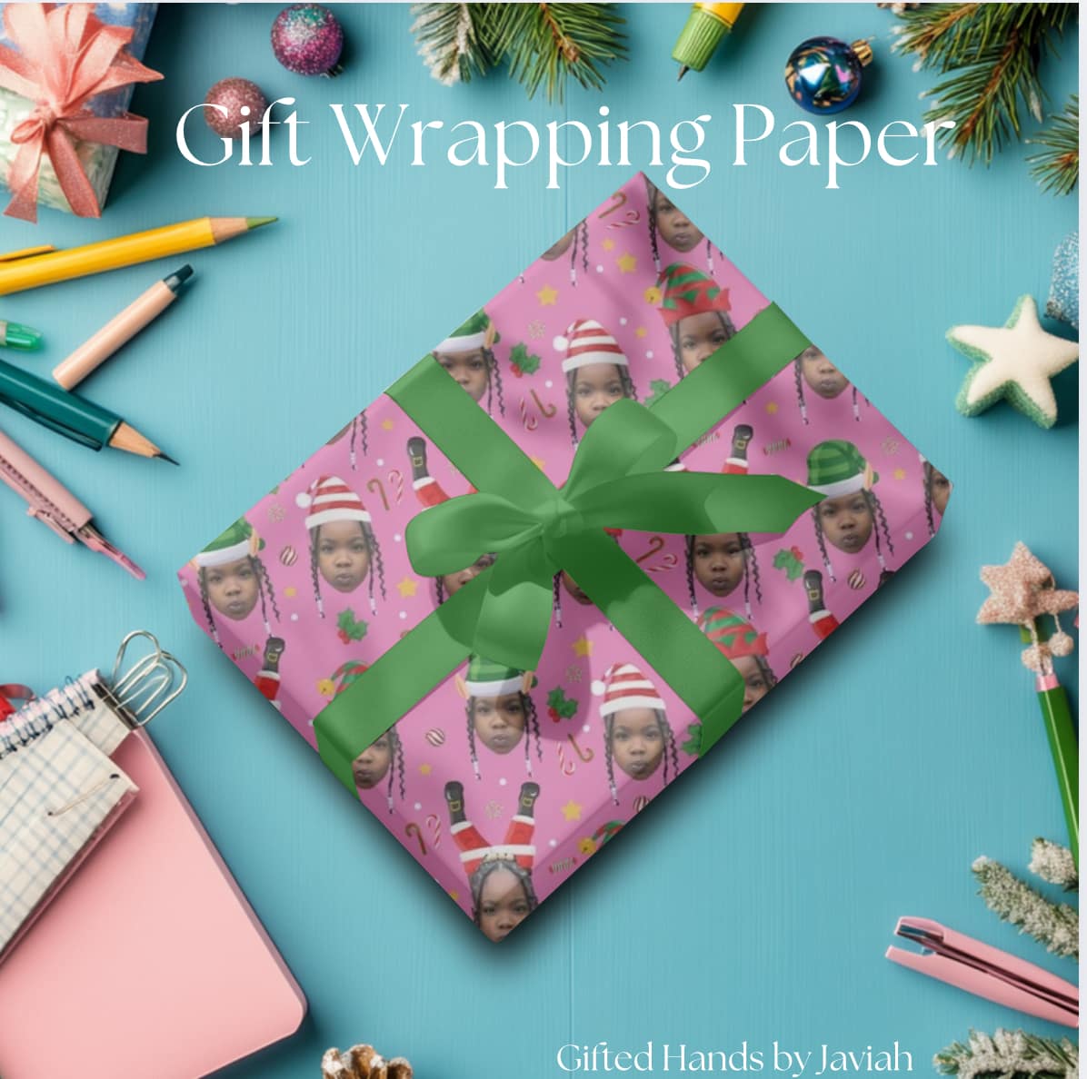 Make your gifts stand out this holiday season with our custom Christmas wrapping paper! Personalize it with a fun design featuring your chosen face wearing festive Santa and elf hats. Available in vibrant red, green, yellow, and pink, this premium wrapping paper adds a cheerful, personal touch to your presents. Perfect for spreading smiles and holiday cheer!