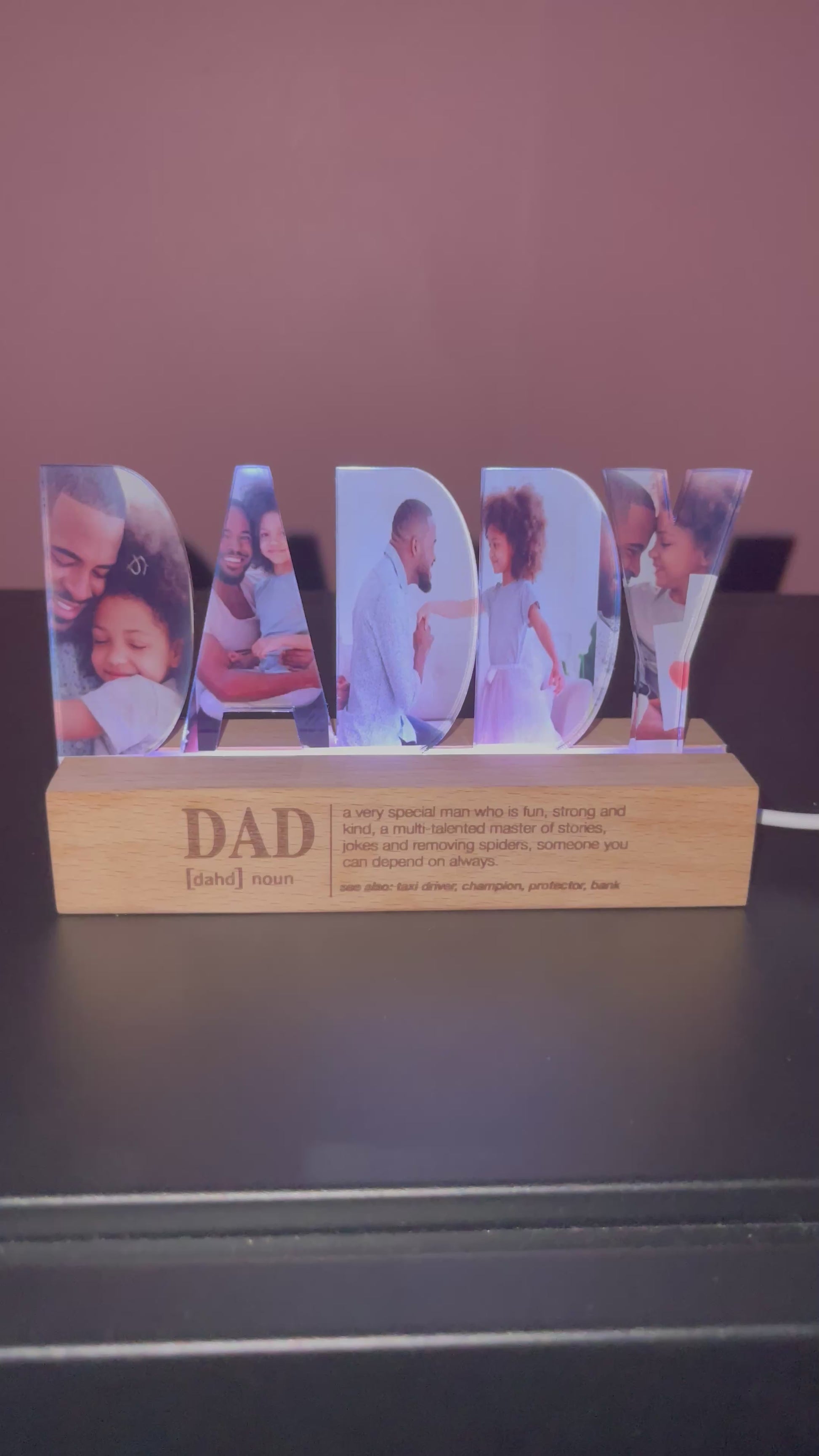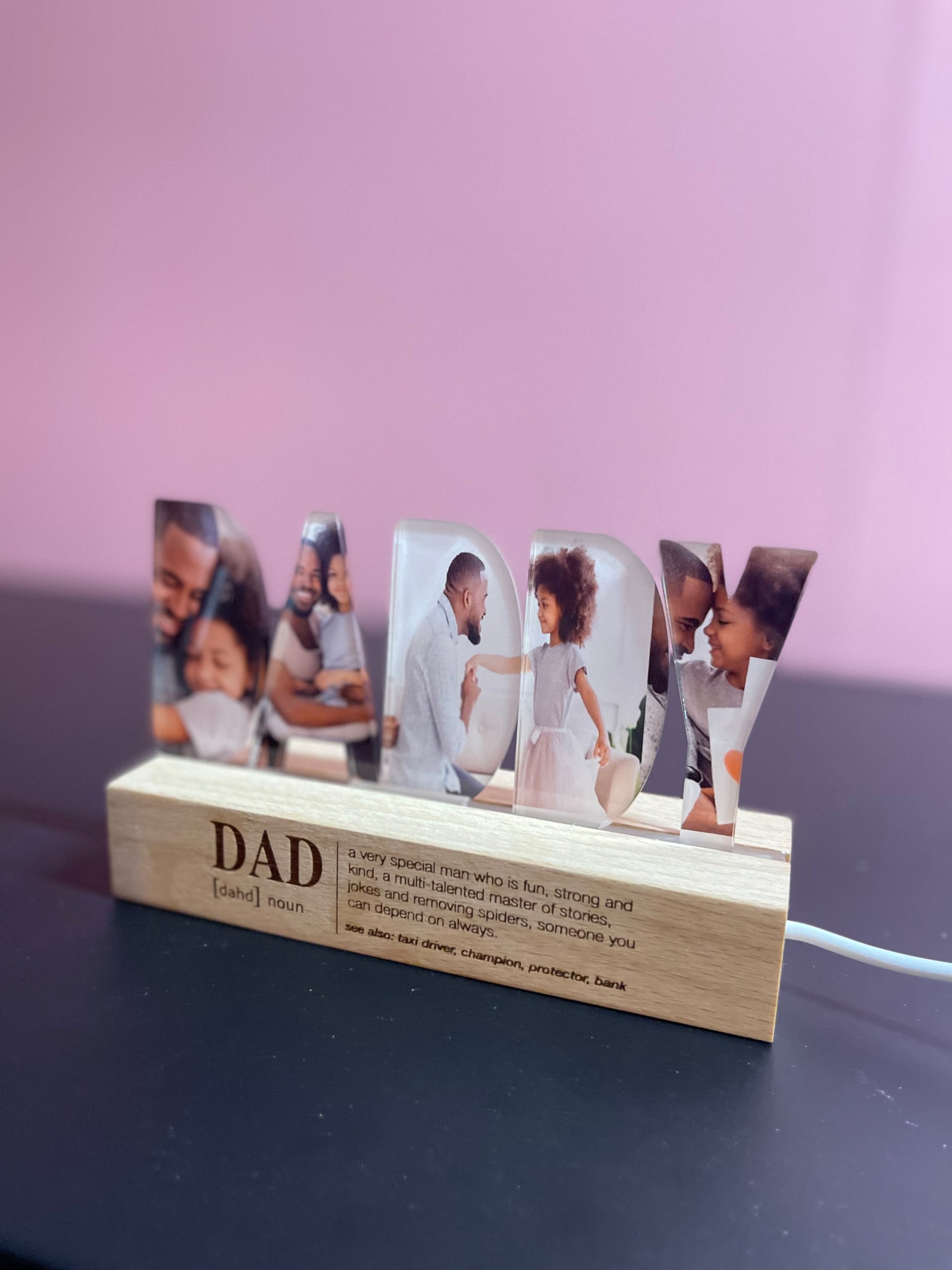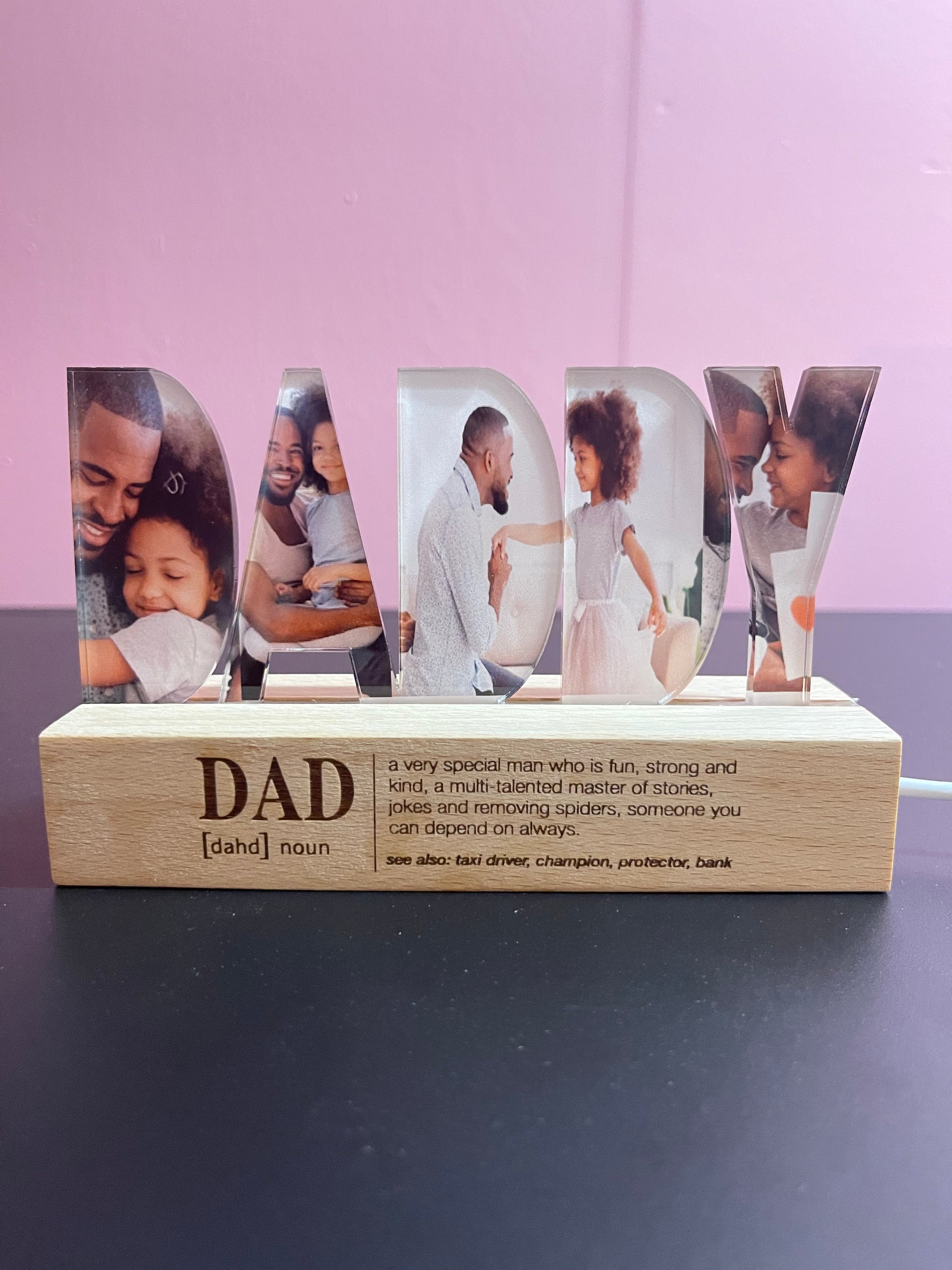 Give Dad a gift he’ll cherish every night with this custom acrylic nightstand display. Thoughtfully designed to sit beautifully on his bedside table, this sleek and modern piece is crafted from high-quality clear acrylic and personalized with pictures and your choice of message, names, or a special date. Perfect for Father’s Day, birthdays, or just because, this is more than a gift, it’s a memory made visible.