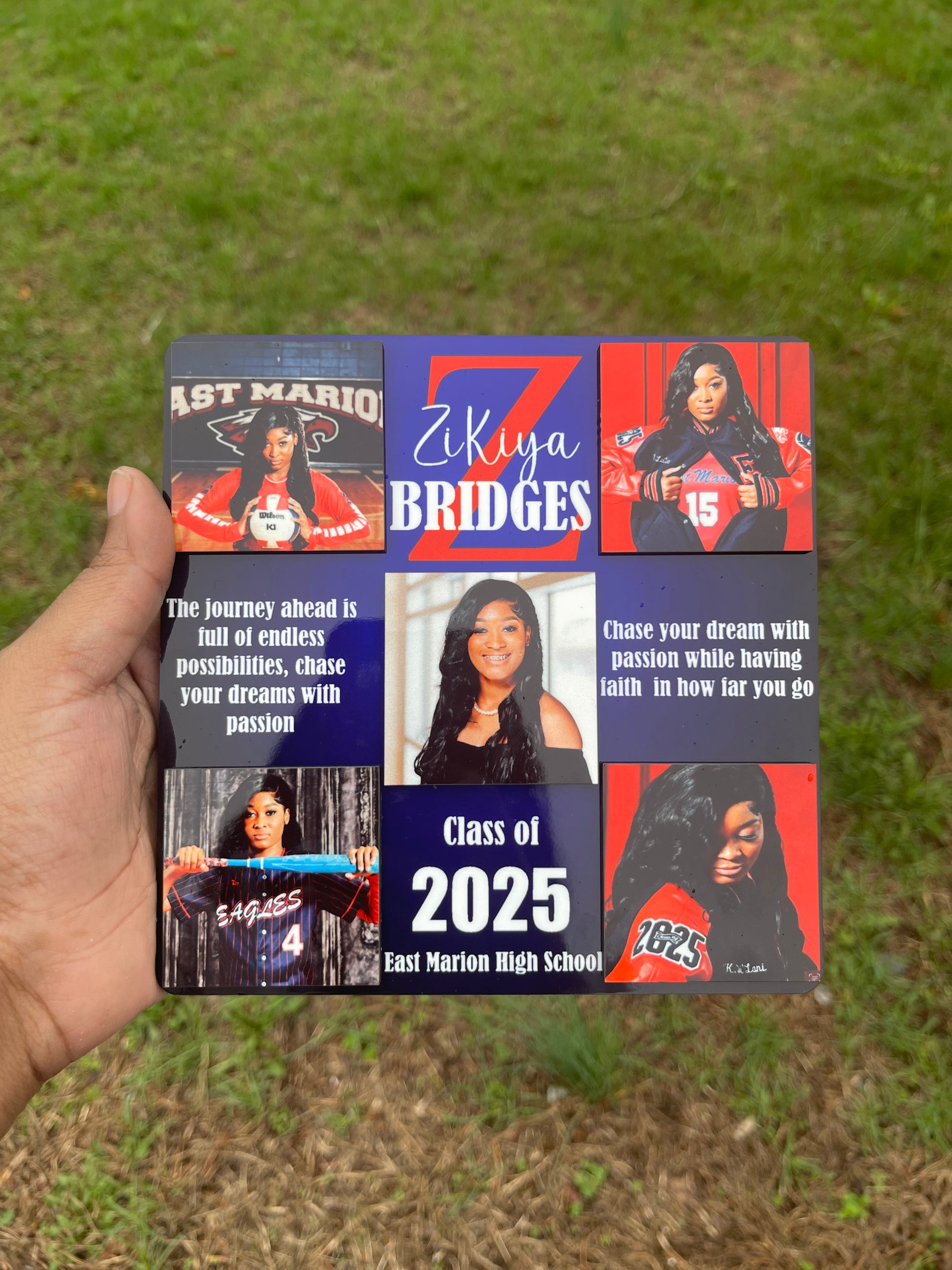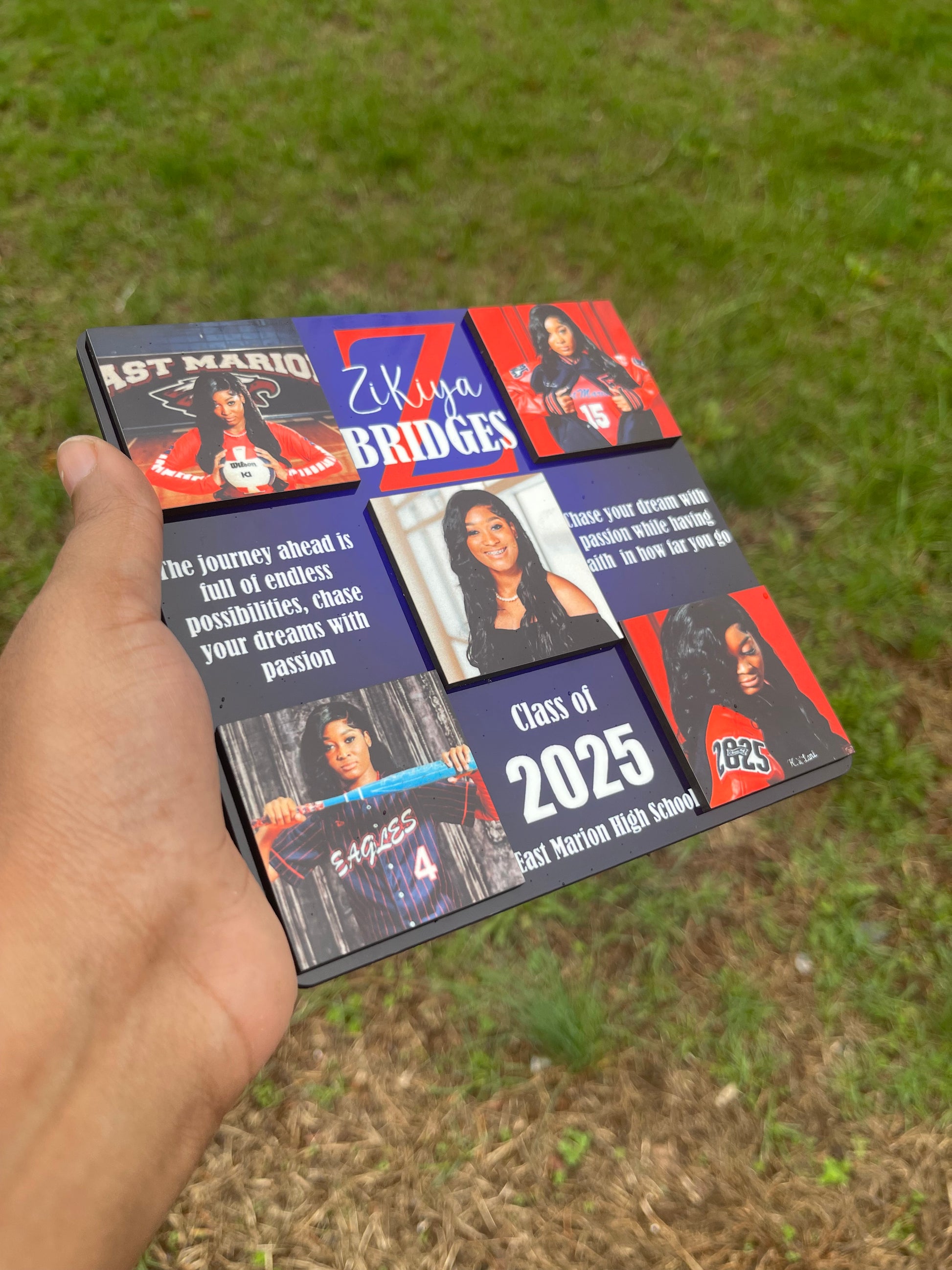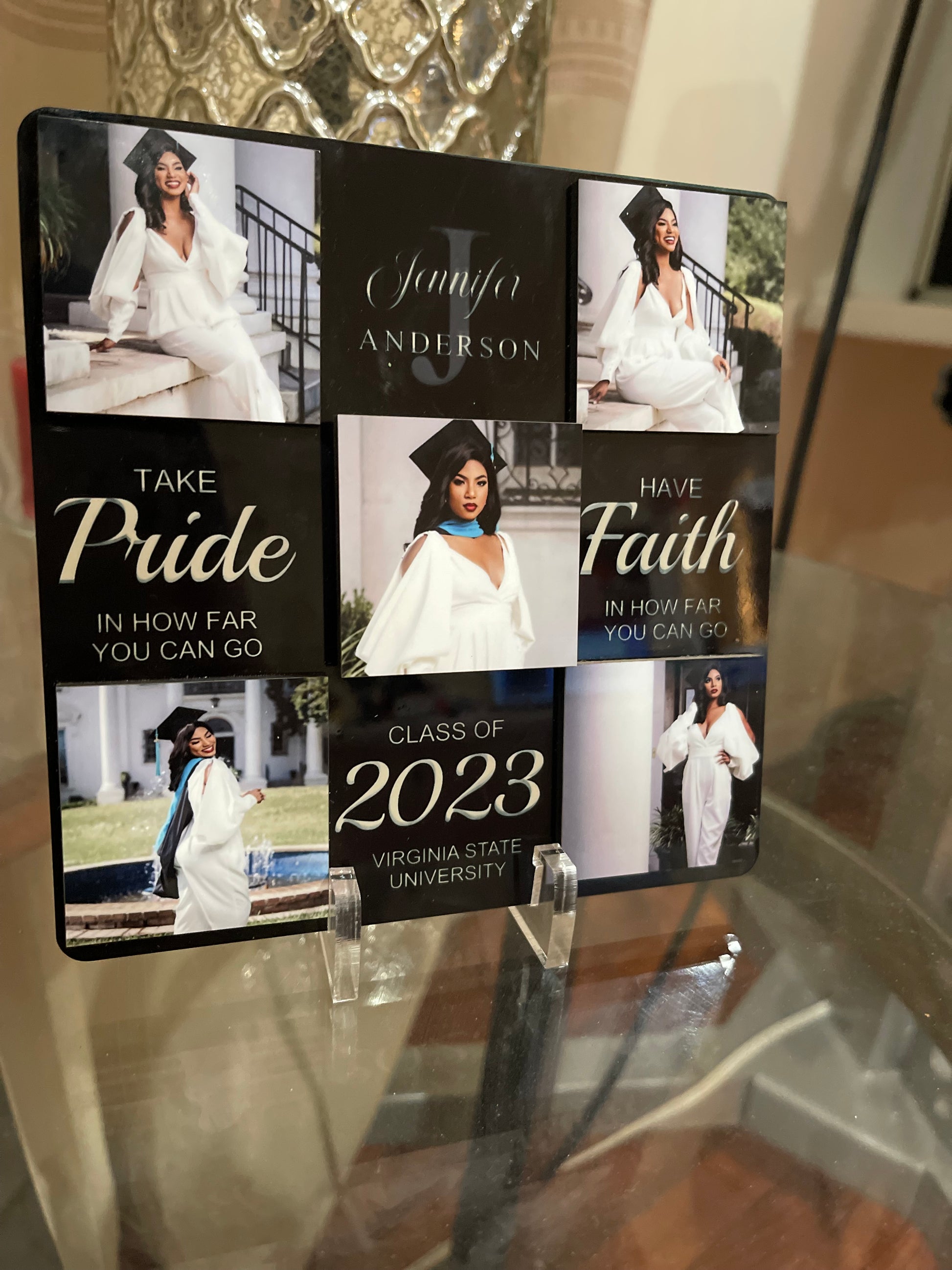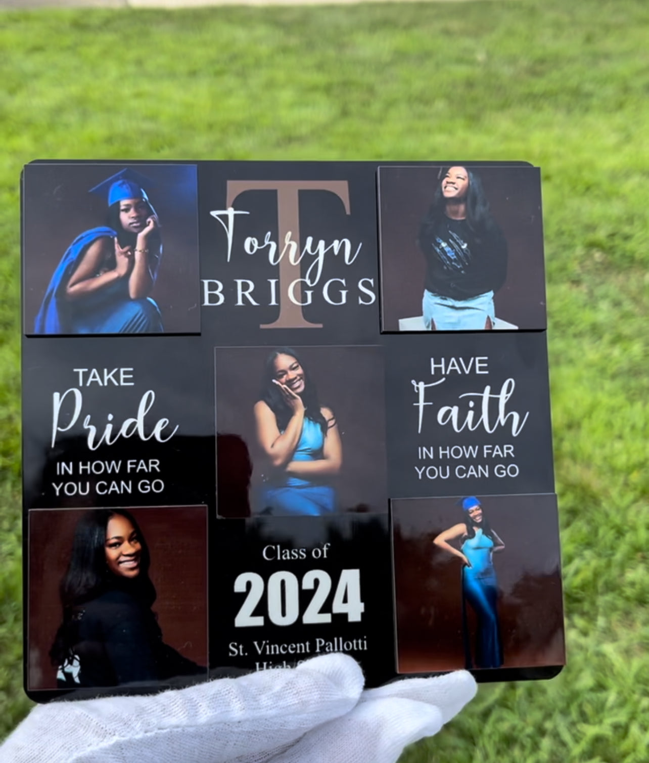 Looking for a really unique, eye catching photo frame to gift a grad or a loved one? Look no further! We'd like to introduce to you one of our very own TRENDY photo frames. The Grad Masterpiece Frame is absolutely stunning once printed with photos and assembled. It's 3-dimensional interface and structure makes this piece indeed a MASTERPIECE! The Grad Masterpiece Frame will make the perfect gift for our grads this season as they are recognized and honored! These are also perfect gifts for Mother's Day, Father's Day, birthdays, or any special occasion. The Masterpiece Photo Frames are durable, stain-resistant, and specifically designed for full-color printed images. These frames can displayed on an easel or mounted to a wall. The frames are one-sided with a high gloss finish.