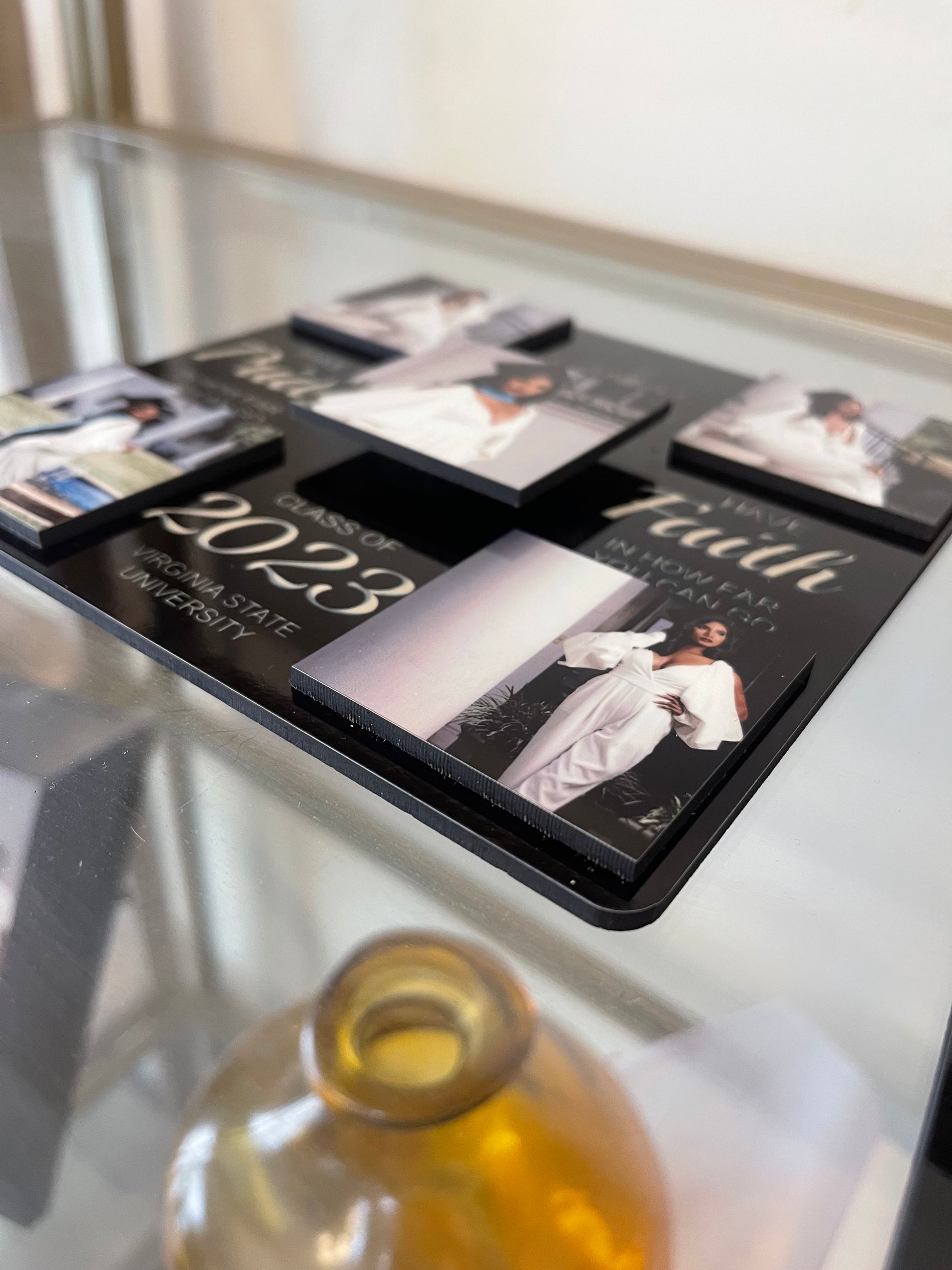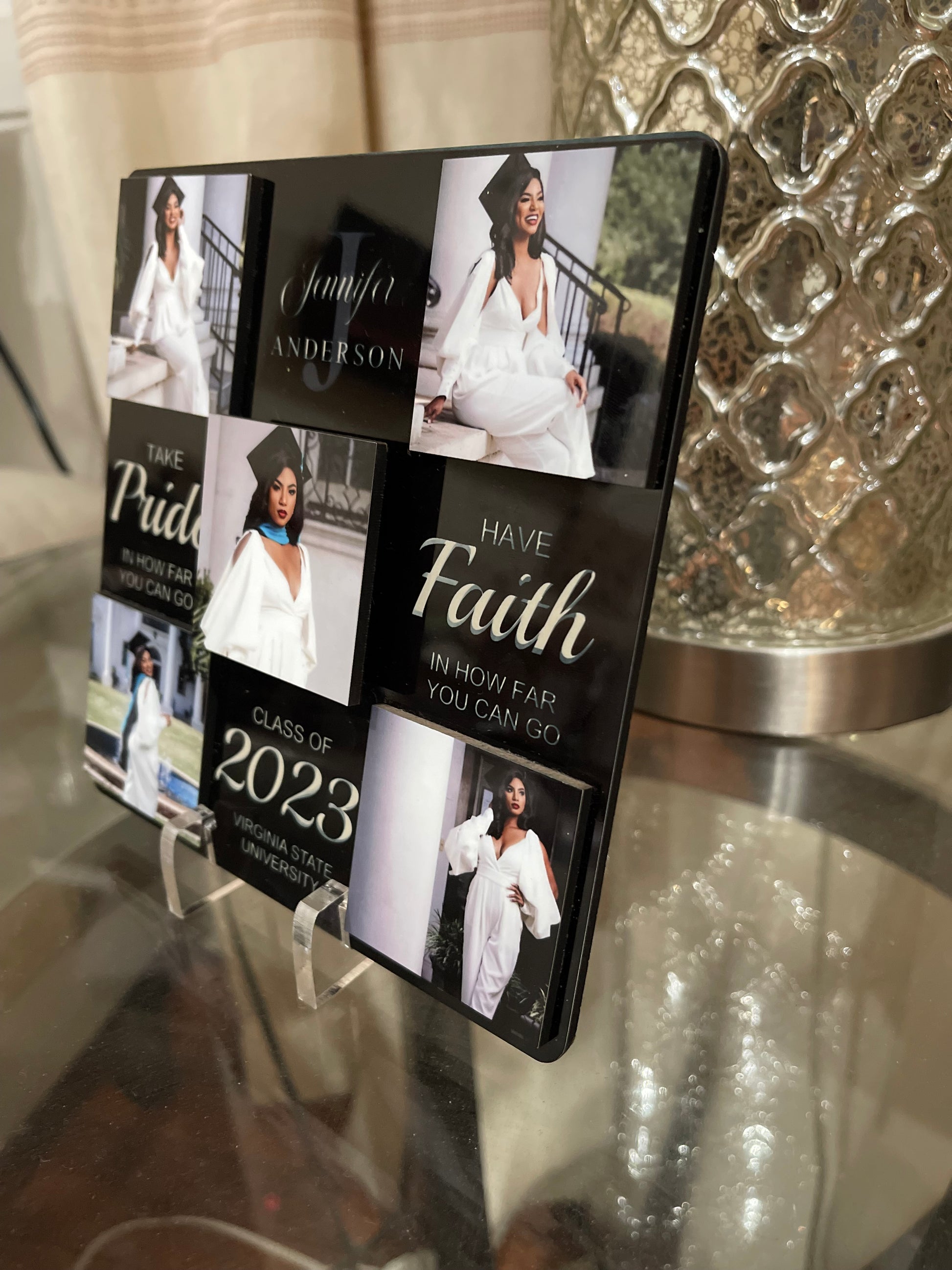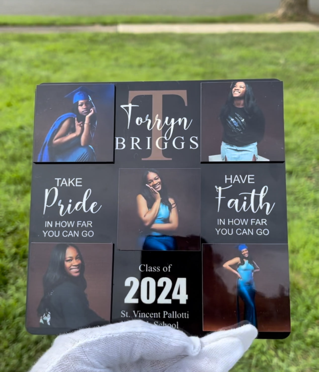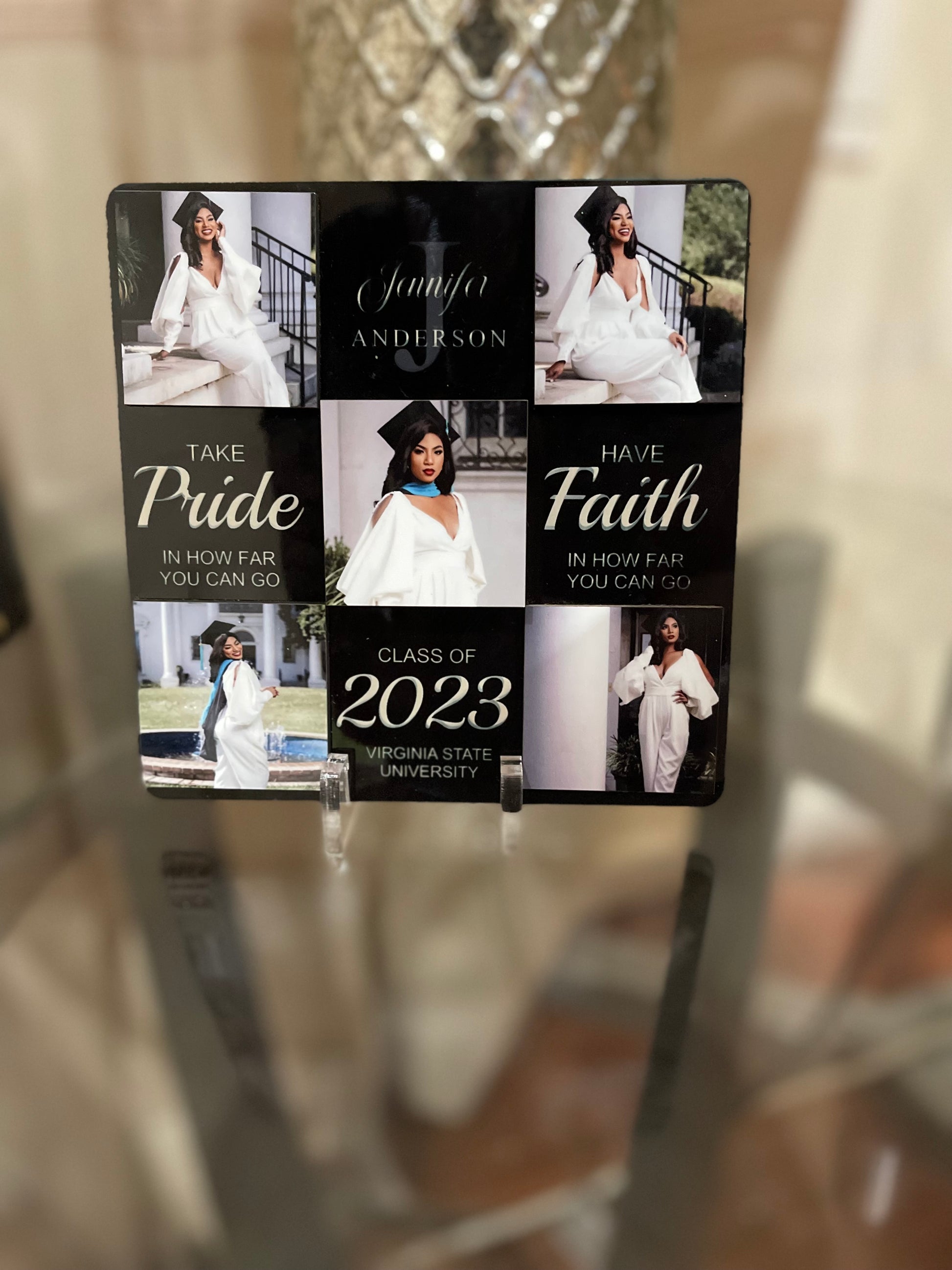 Looking for a really unique, eye catching photo frame to gift a grad or a loved one? Look no further! We'd like to introduce to you one of our very own TRENDY photo frames. The Grad Masterpiece Frame is absolutely stunning once printed with photos and assembled. It's 3-dimensional interface and structure makes this piece indeed a MASTERPIECE! The Grad Masterpiece Frame will make the perfect gift for our grads this season as they are recognized and honored! These are also perfect gifts for Mother's Day, Father's Day, birthdays, or any special occasion. The Masterpiece Photo Frames are durable, stain-resistant, and specifically designed for full-color printed images. These frames can displayed on an easel or mounted to a wall. The frames are one-sided with a high gloss finish.