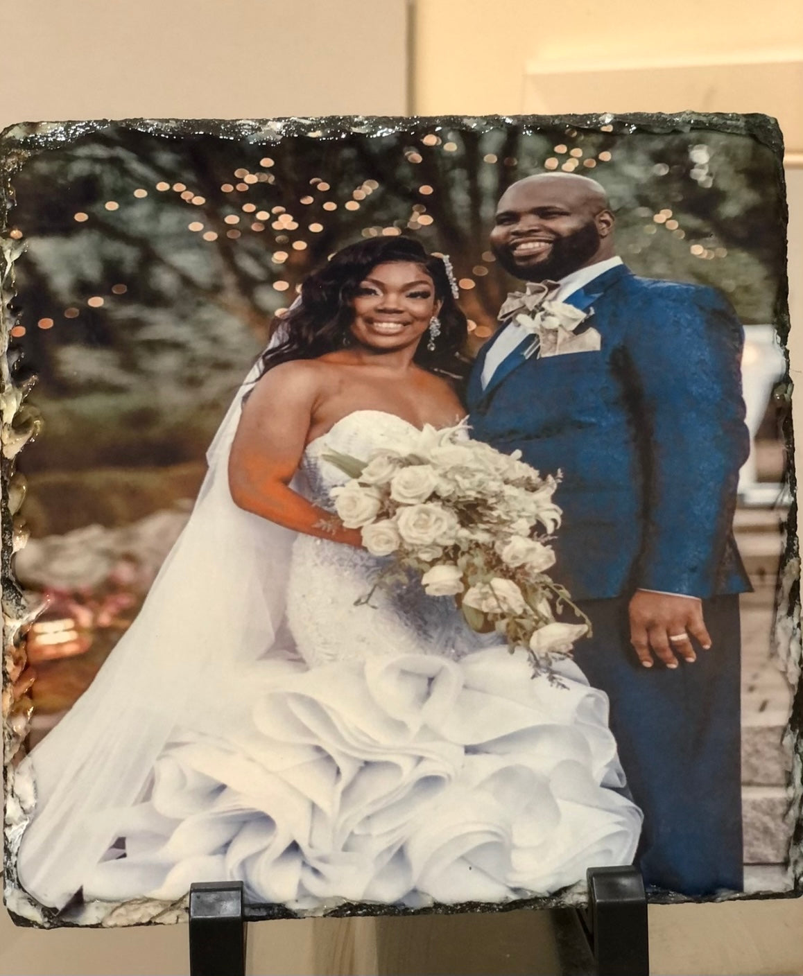 This genuine slate gift will stand out as a unique wedding gift, graduation gift, or housewarming present with your personalized photo, custom message, and the unique fractured edges. This slate photo plaque comes with plastic feet for free standing display!