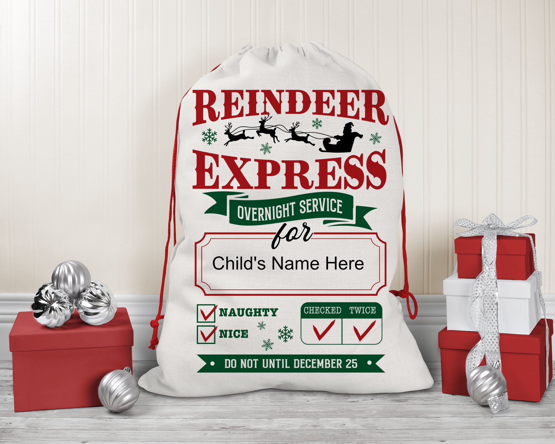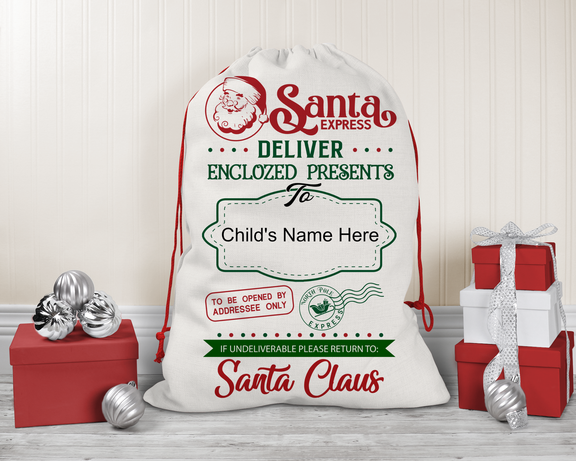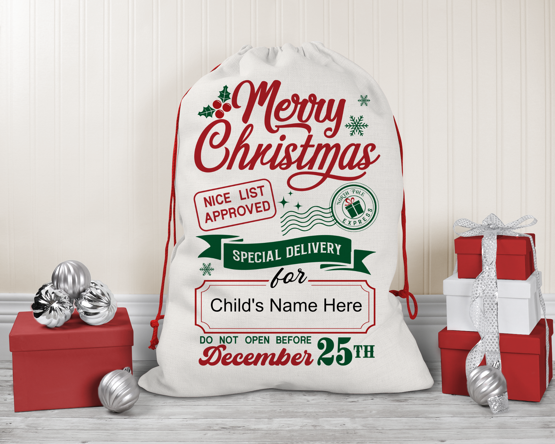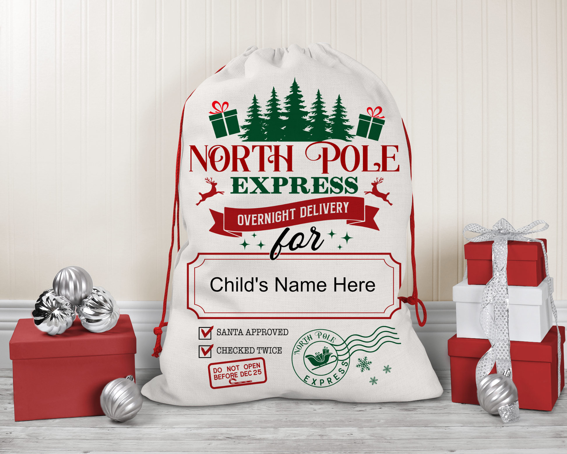 How amazing would it be to start a new family tradition and "deliver" toys all the way from the North Pole with our Santa Claus Bags? These Santa Claus Bags will certainly put a huge smile on your kids faces! Make your little ones feel extra special with a personalized touch by putting their name on the bags.